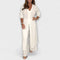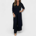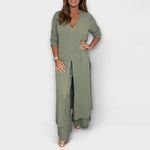 - Модерен привлекателност: Дълга туника с елегантен разрез и свободно прилягане, съчетана с прецизно изработени панталони.
