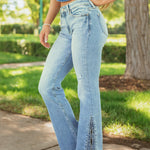 Тези дънки са перфектната комбинация от женствена елегантност и модерен стил. Дизайнът с разкроени крака и деликатна цепка в долната част добавя лекота и се отличава с модерен завършек. Високата талия красиво подчертава фигурата, а деликатните абразии им придават характер и небрежен вид. Този модел е идеален както за ежедневни, така и за по-елегантни аутфити.