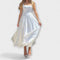 Тази стилна миди рокля е изработена от луксозен сатен или висококачествена текстилна смес, създавайки изискан силует с красив блясък. Прилягащият корсет, квадратното деколте и деликатните спагети презрамки красиво подчертават раменете и талията.